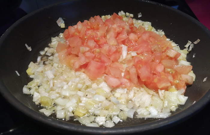 Sofreímos en una sartén el ajo picado junto con el puerro. Cuando esté pochado añadimos el tomate cortado en daditos y sin piel. Le damos unas vueltas y lo llevamos a la BBQ junto con el resto de los ingredientes.