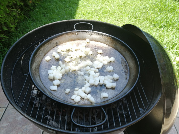 Colocamos la paellera o paella en la rejilla de la BBQ, le añadimos un chorrito de aceite de oliva virgen extra.