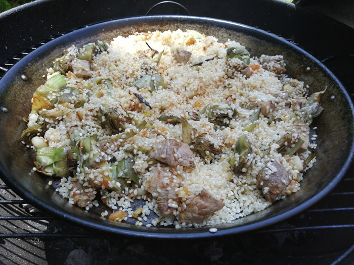 arroz bomba Illa de Riu, con sepia, alcachofas y magro de cerdo en BBQ