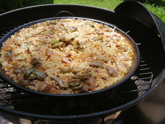 Comprobamos que el arroz está en su punto. Retiramos la paella de la BBQ y dejamos que repose el arroz fuera del fuego un par de minutos.