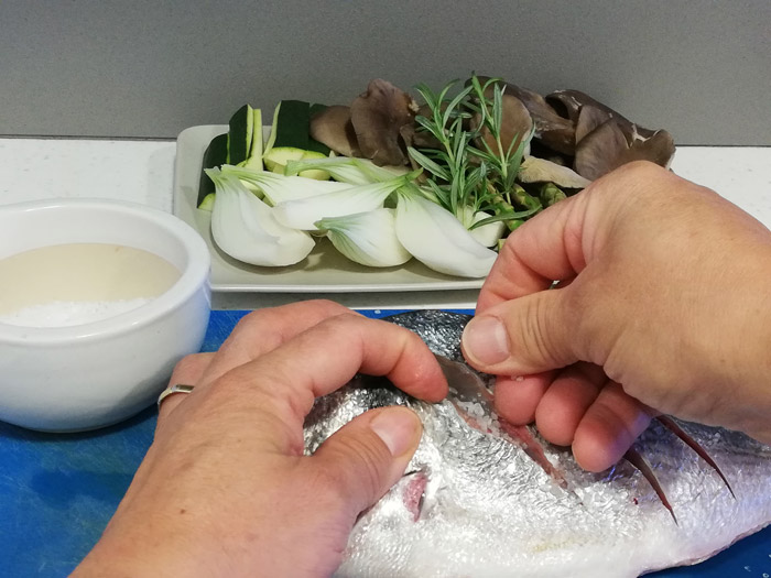 1- Deslomar la dorada y colocar en un plato un lomo junto con las verduritas y el jugo del conjunto.